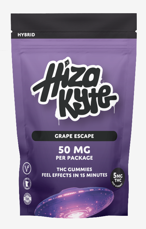 Hiza Kyte - Grape Escape Gummies - previously known as Purple Nerdz - same great taste and effect - new look and name! Flavor profile: Grape + Lime Terpenes: Perple Nerdz Effect: Uplifting